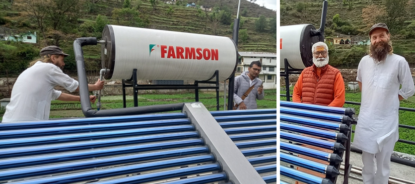 Right from the beginning, ashram sadhaks were actively involved in each and every step and provided constant supervision and help in installing these systems. The response was wonderful and villagers especially women expressed true gratitude because of reduced heavy labor in carrying fuelwood from high forests. These solar heater units provide hot water for the various works of daily routine from morning to late evening e.g. morning tea, bathing, washing pots, cooking food, taking care of cow/buffalos, washing clothes etc.